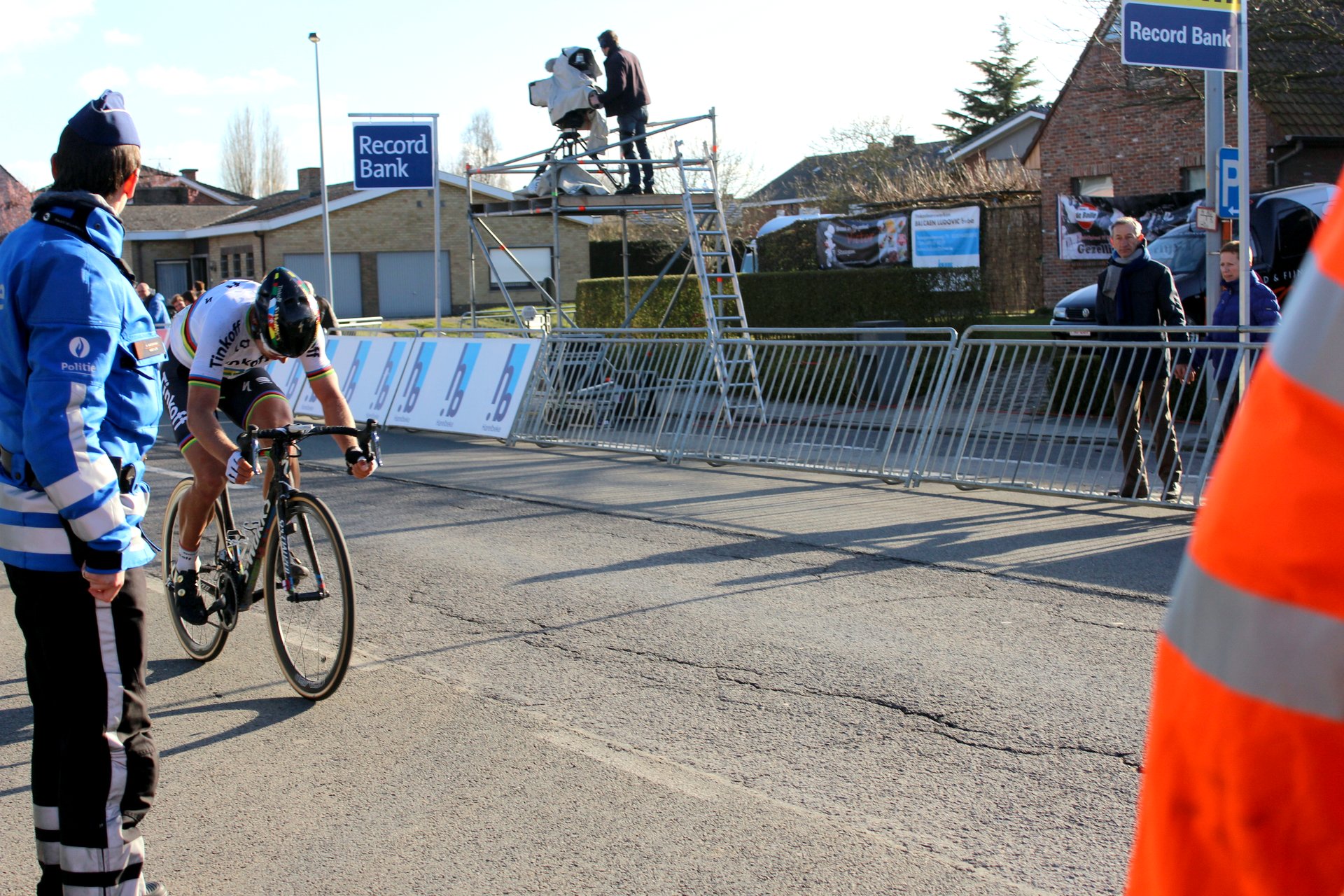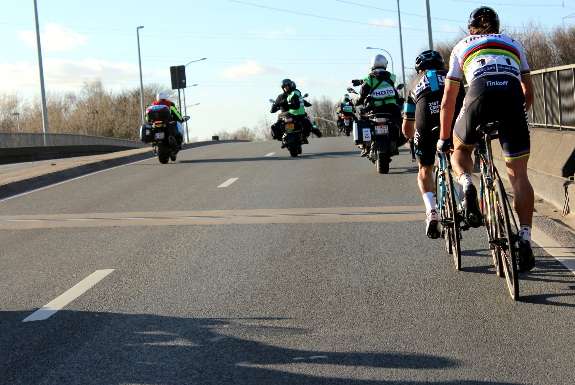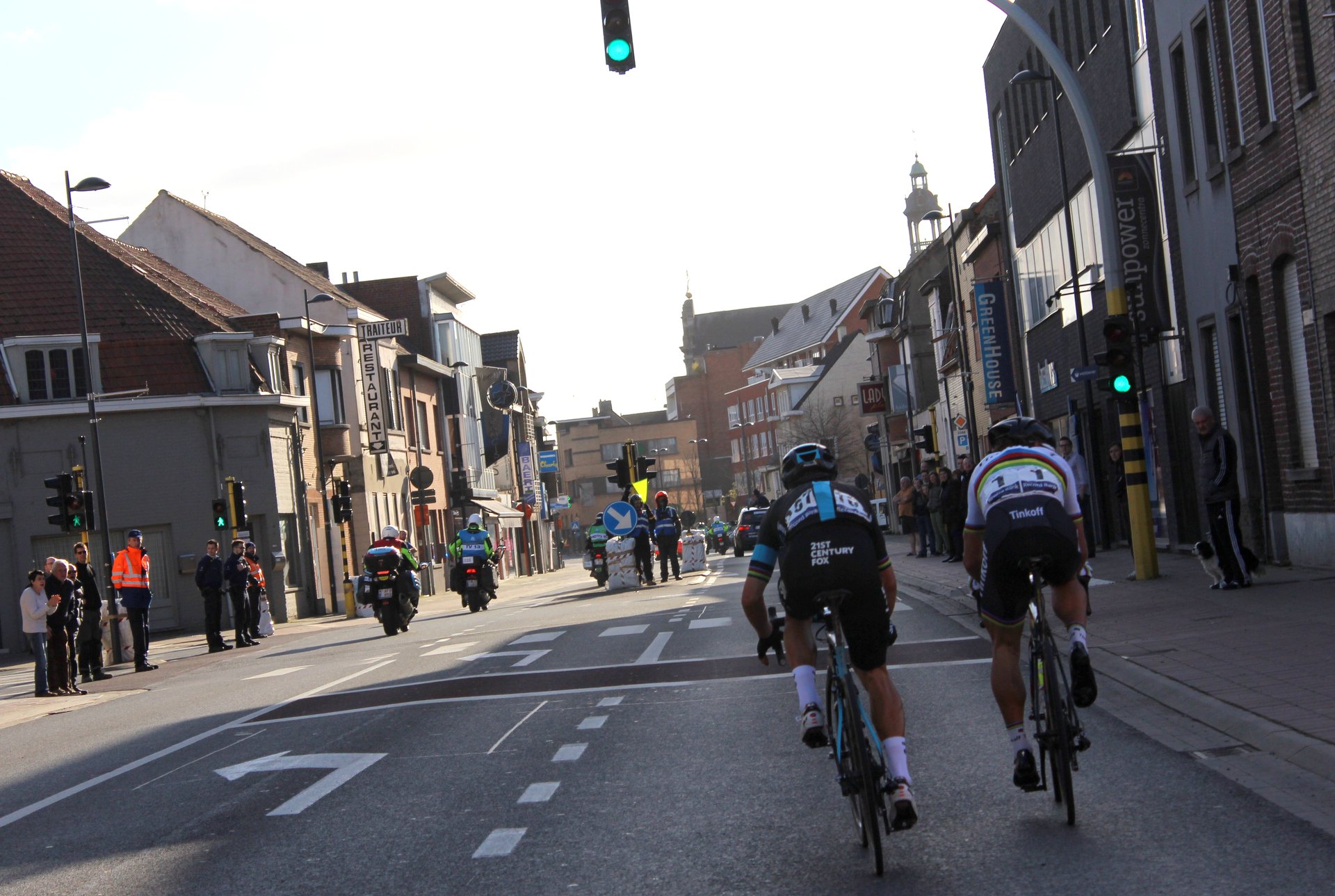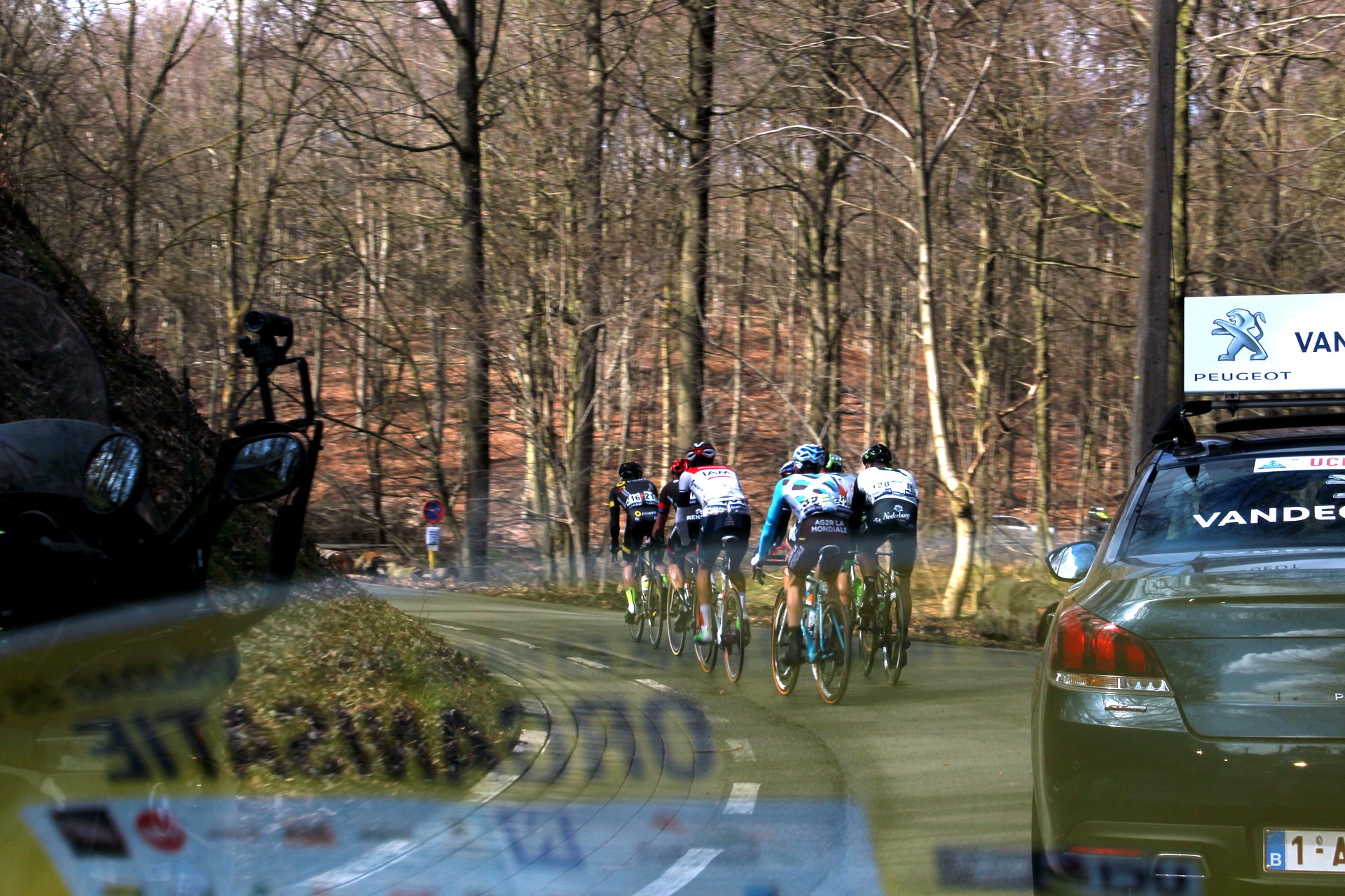 Rudie is a skilful driver, zipping along the back roads of Belgium with motos surrounding him. On television you never really see the sheer volume of motorbikes involved in a race the size of E3. It seems like every motorcycle rider in Flanders has been pulled in. There are the obvious ones, carrying TV, radio, and photographers, flitting around the head of the race, on roads barely large enough for a single car. Every junction, every piece of road furniture has an outrider on, blowing their whistle and waving their flag. These guys (seemingly all males) perform an admirable job, rolling around the race at breakneck speed. So many of them.