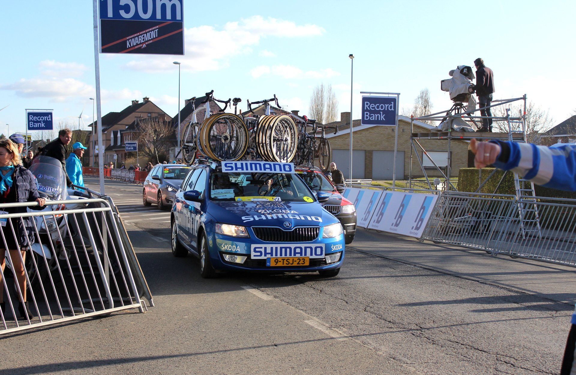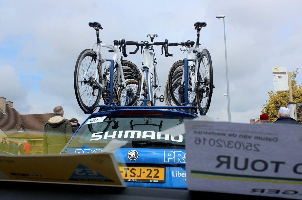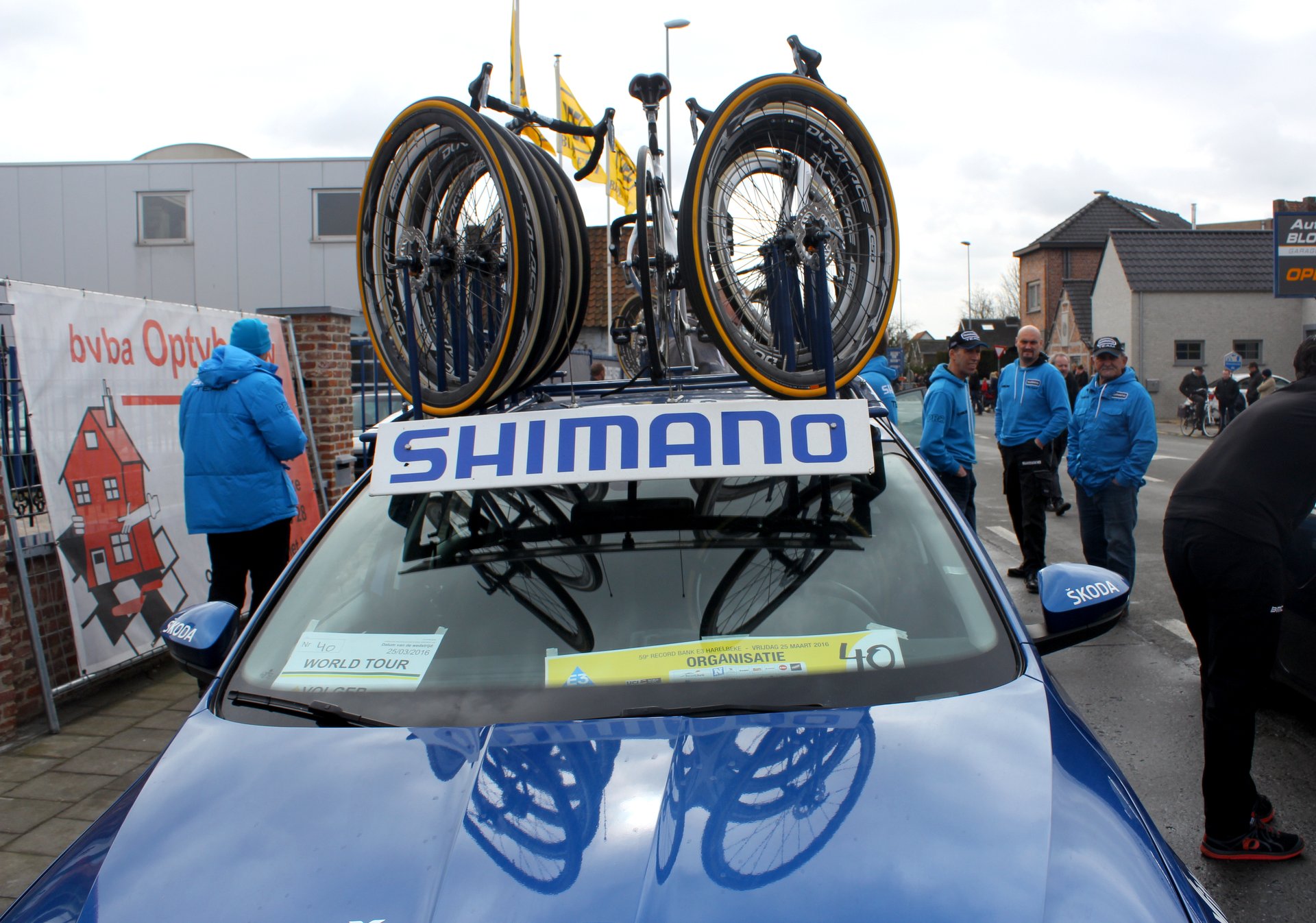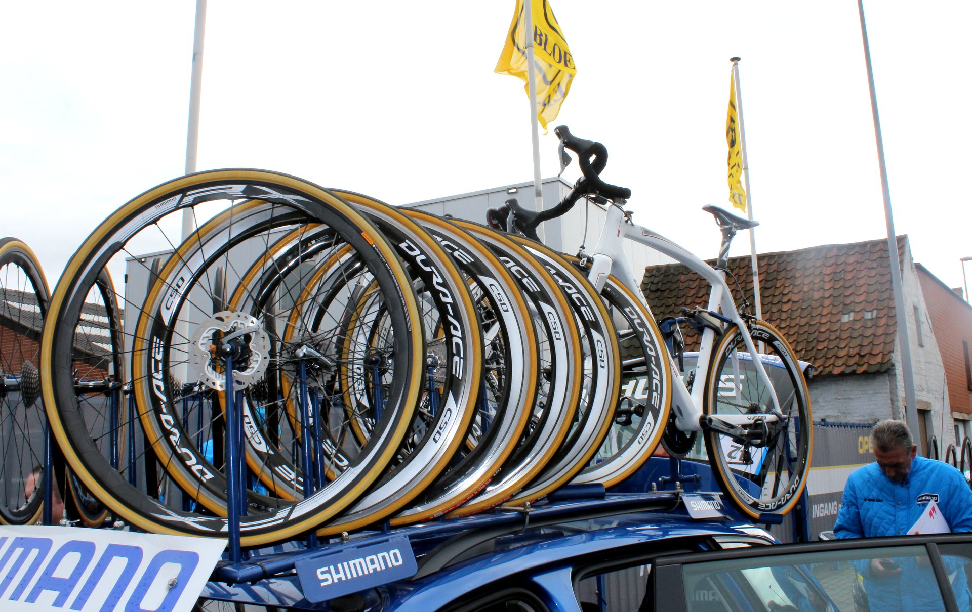 Ultimately, however, the role of the Shimano Neutral Service is that of mechanical back-up, but one that teams and riders hope is never needed. The car carries three complete bikes on the roof; unbadged frames with Shimano Dura-Ace groupsets and a bunch of Dura-Ace C50 wheels, with more in the car and in the boot. We also carry a set of Shimano’s RX830 wheels, currently the top-end road disc brake wheelset from the Japanese manufacturer. Looking around the team buses before the race it seems the RX830s will remain unused today as none of the teams appear to be riding disc-equipped bikes.