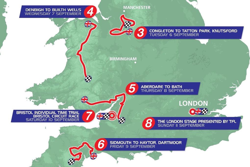 Sunday September 4: stage one – Glasgow to Castle Douglas, 168km Monday September 5: stage two – Carlisle to Kendal, 195km Tuesday September 6: stage three – Congleton to Tatton Park, Knutsford, 182km Wednesday September 7: stage four – Denbigh to Builth Wells, 217km Thursday September 8: stage five – Aberdare to Bath, 205km Friday September 9: stage six – Sidmouth to Haytor, Dartmoor, 150km Saturday September 10: stage 7a – Bristol, 15km ITT; stage 7b – Bristol, 76.5km Sunday September 11: stage eight – London, 100km