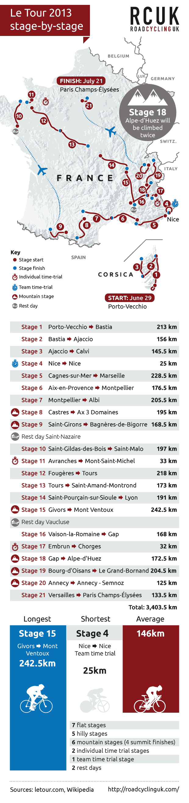 The 2013 Tour de France takes in a 3,403.5km route, scaling some of the most infamous mountains in the long history of the race, including a double ascent of Alpe d’Huez on stage 18.