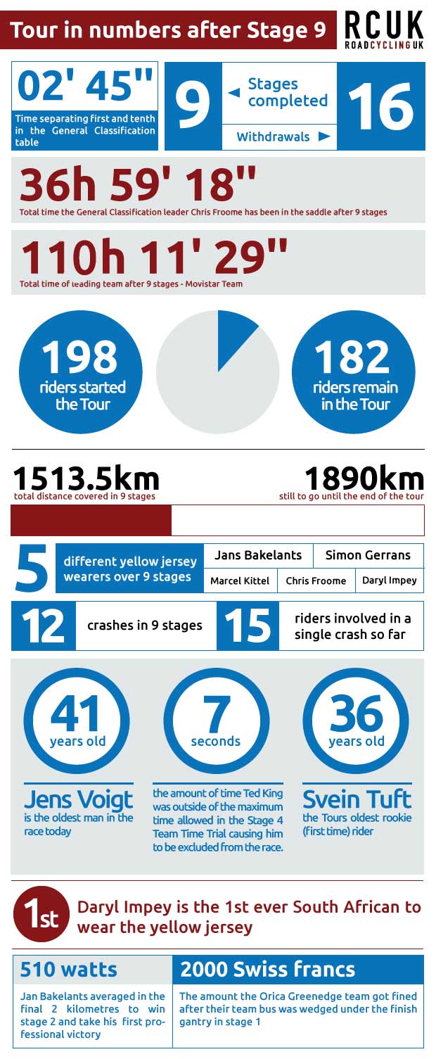Twelve crashes, 16 withdrawals, and nearly 37 hours in the saddle for race leader, Chris Froome, tell the tale of an enthralling and gruelling first week of the hundredth Tour.