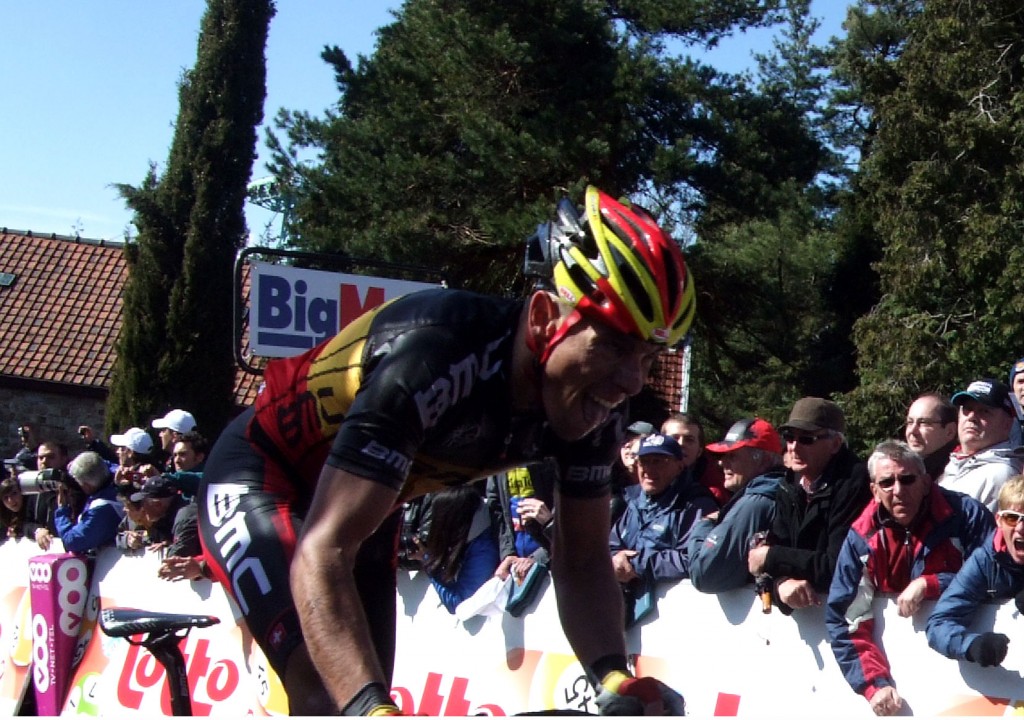 The men are back now and much more spread out. Rain has spattered man and machine with mud, though the sun is now shining. The noise of the crowd is huge, they bang the boards and shout loudly, “Philippe, Philippe, allez Gilbert!” as, near the front of the main peloton, the Belgian national champion rides past in company with all the other favourites for the day. Obviously battle weary they manage to look alert and are almost inconceivably fast, considering what they have just ascended. The group is now spread down the hill, the stragglers escorting the convoy of support vehicles with the smell of burning clutches adding to that of frites and beer in their nose.