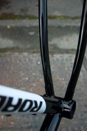 With a wheel or tyre change it’ll happily dance between some cyclocross, commuting, gentle tow path bashing, touring (with rack and mudguard mounts) and everything else in between. It’s an interesting frame with some nice detailing. There’s rack and mudguard mounts all over, a headtube/downtube gusset so it’ll take a pounding on the streets, and the skinny seat stays will offer some compliance for rough riding. And there’s plenty of mud clearance for cyclo-crossing – and check out the bridgless chainstay, we like.