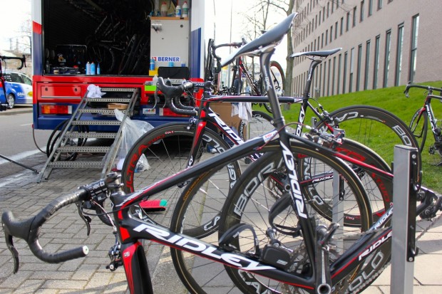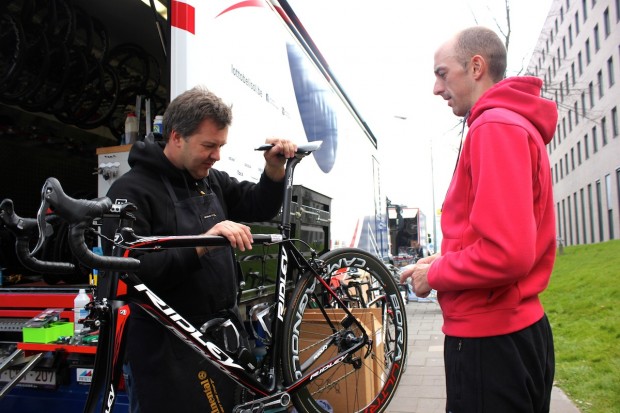 Our conversation begins as Vanendert drifts back inside the hotel behind the giant Lotto-Belisol truck from which van Roosbroeck works, while he makes final preparations to the fleet of Ridley Helium SL machines on which his riders will compete the following day. He screws a race number to each and racks them neatly beside the truck. This must be far from his first interview, and he has twice politely sent me away as he works to complete his preparations, on the first occasion with Vanendert’s machine to photograph: a not inconsiderable consolation. A bike, how ever idiosyncratic its set up, can only tell so much. The mechanic will say much more.