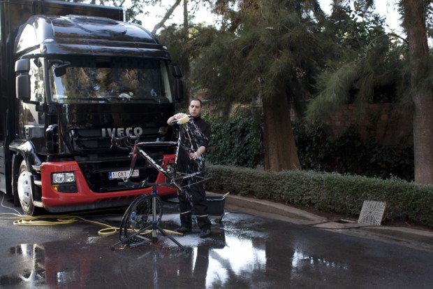 The atmosphere around the team is relaxed throughout my visit. The riders are dictated by routine: eat, sleep and ride – sometimes logging more than 35 hours a week on the bike – and the three mechanics on duty on Spain have only to ensure the 19 riders present have their bikes ready for the next day’s training. The warm sun and varied terrain offers a welcome escape from the Belgian winter and, sprint training aside, a rare moment of relative calm before the season starts in Australia.
