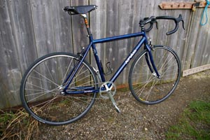 Someone had given me an unwanted but really rather lovely old 170mm Shimano 600 double crankset a year before I started building Spalding and, with shorter chainring bolts it’s made a super 42 single set that drives a KMO Narrow chain onto a Miche 17 tooth sprocket. That gives gearing a shade under 66 inches, which, believe me, around here in Shropshire, is more than enough….