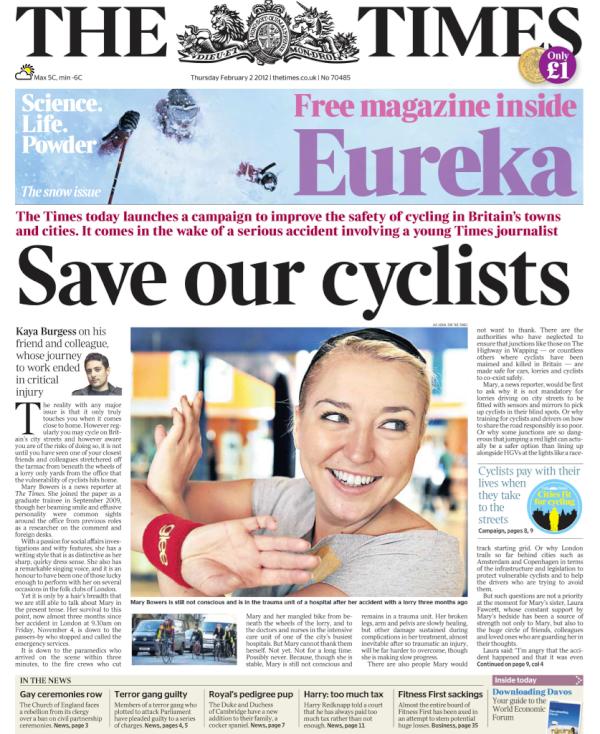 The campaign comes after a Times journalist, Mary Bowers (pictured on the front page), was seriously injured after being hit by a lorry just yards from the newspaper’s office on The Highway in Wapping, a key arterial route into the capital. Mary remains in a coma, three months after the collision.