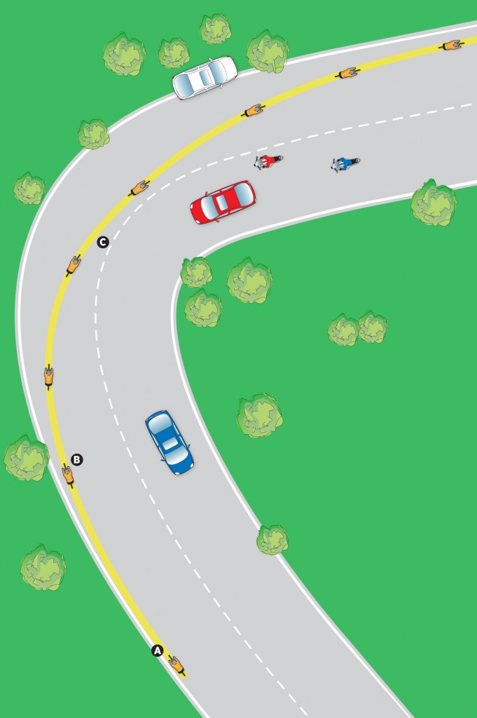 At position ‘B’ in our diagram you can see sufficiently through the bend to plan your line and this is where you start ‘turn-in.’ Begin by shifting your body weight slightly forward as more weight over the front wheel gives you more control over the bike. At turn-in, experienced riders will also apply a bit of ‘countersteering’.