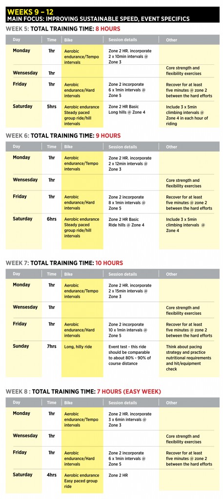 If you’ve been following this series and are preparing to take part in your first 100 mile sportive, you’ll already have your first 8-weeks preparation in the tank. The outline of what your final 4-weeks of preparation might look like is presented below. In this phase of the training you’re simply increasing the distance of your longest ride to something close to event distance as well as adding in some of the shorter, harder interval work we discussed last week that should enable you to sit comfortably with other, more experienced riders or groups of riders.