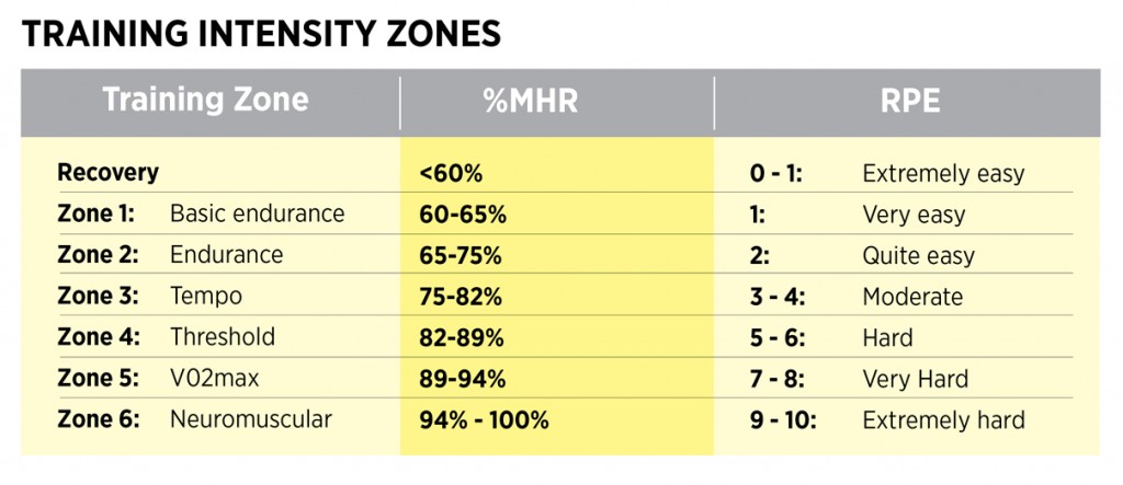 So for your sportive training programme you’re going to need to progress your training load by measuring your intensity. You need to establish what easy, medium and hard efforts feel like in order to include them into your programme and understand how they contribute to the training load. Below is a comparison chart for what the relative training intensities look like, depending on which system you use.