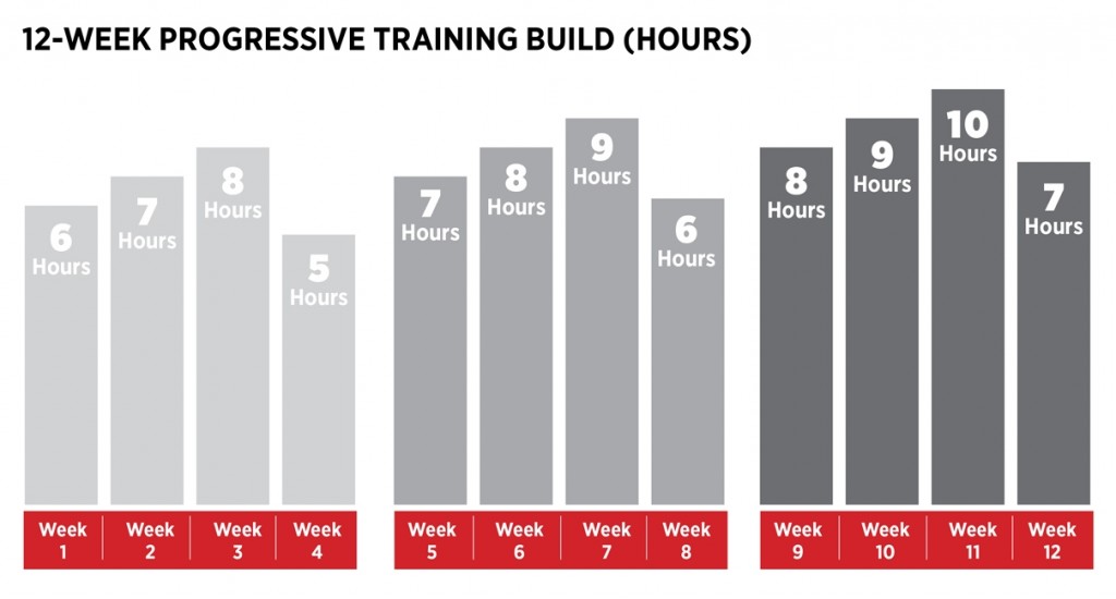 The important thing to consider here is that if you have a maximum of 10 hours training you can commit to, but are currently only riding for three or four hours, don’t jump straight in to riding for 10 hours. We’re looking for a smooth progression as you build up to higher volume, thus gradually acclimatizing yourself to the increasing training load. A good place to start is by using a classic stepping stone approach of three weeks build, one-week recovery that would look like this.