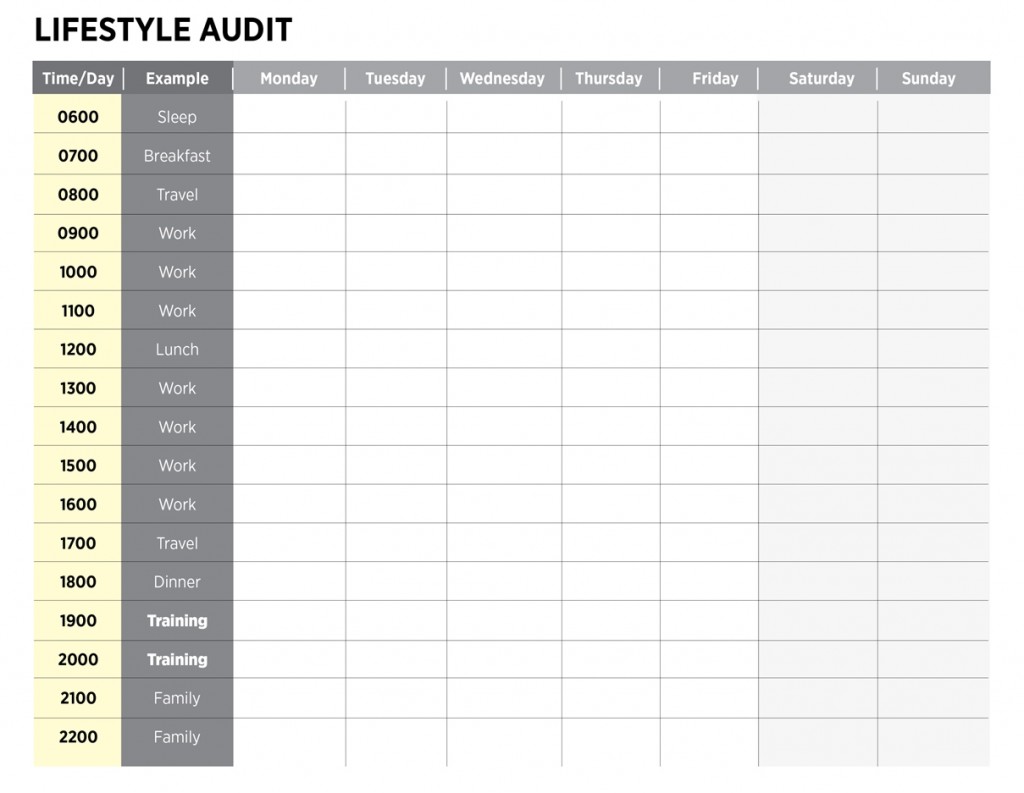 The next thing you need to do is work out the maximum amount of hours you will be able to train in a week based on your family, work and other commitments. Do this by completing a lifestyle audit for each day of the week, which looks like this: