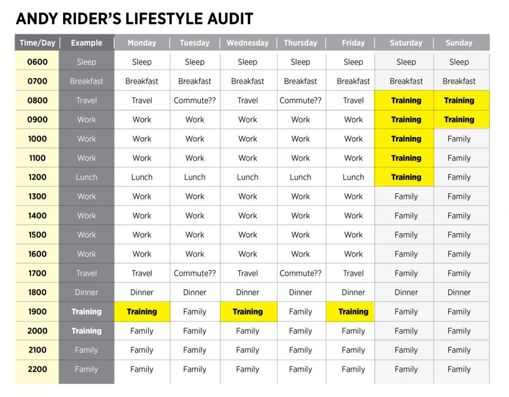 So begin by compiling your own lifestyle audit based on his example. Fill in when you eat, sleep, work, spend time with the family and have time available for training. Don’t worry, you don’t have to commit fully at this stage, and there is rarely a ‘typical’ week, this is just a starting point. When you’re done, highlight the areas you’ve marked as ‘available for training’ in yellow and you have an idea of how much training time is available and what kind of pattern it provides.