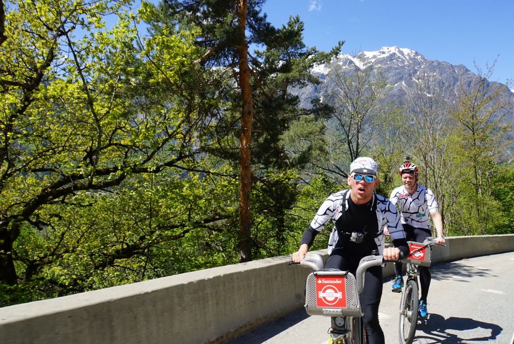 The group climbed the 21 hairpins of Alpe d’Huez, which rises for 13.8km at a grueling average gradient of 8.1 per cent and with long pitches over 11 per cent, in one hour and forty minutes – no mean feat on a three-geared bike with heavy, fat tyres and weighing 23kg in all.