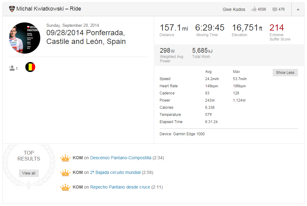 Kwiatkowski is a regular Strava user – we brought you analysis of his victory from stage four of the Tour of Britain – but his winning ride from Ponferrada, Spain, is undoubtedly the Pole’s most valuable to date.