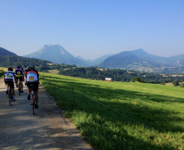 By now it was warm, even at 8am, and with a long day ahead of me and the temperature forecast to reach 30c, I drank at regular intervals, stopping to refresh my bottles and grab a banana at the first feed stop, midway through a trio of category three climbs – the Col de Leschaux, Cote d’Aillon-le-Vieux and Col des Pres – which followed the opening ascent. This is the Alps at its best: smooth, steady climbs; lush, rolling meadows and small rustic villages, whose inhabitants lined the roads, rattling cowbells and cheering on riders with cries of ‘allez’. The true spirit of the Etape.