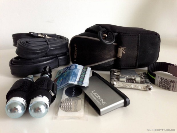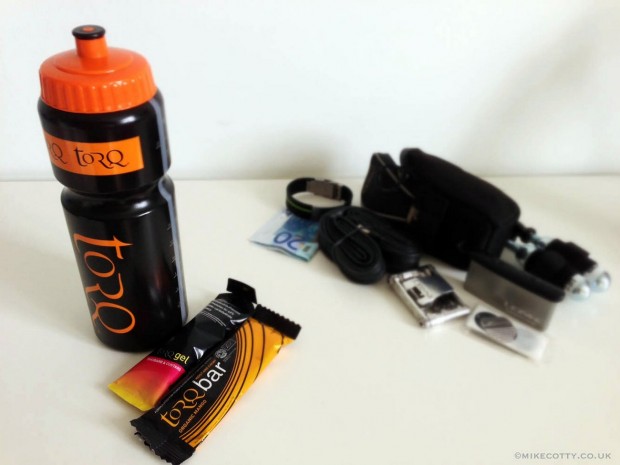 Speaking of which, your saddlebag should contain the normal essentials: a couple of inner tubes, tyre patches and multi-tool, but also throw in some money, a form of identification and an extra gel – consider it your get-out-of-jail gel if you’re really suffering after the final feed.