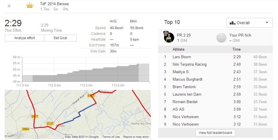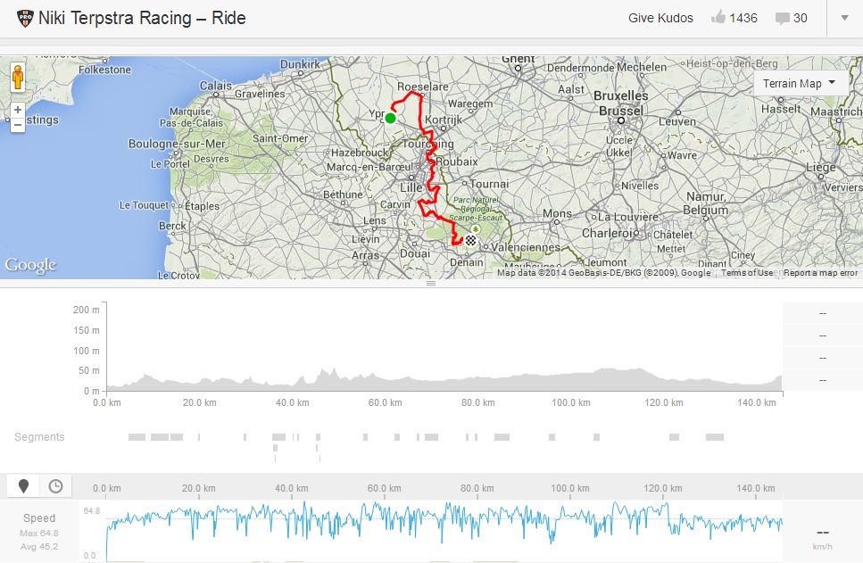 And his ride details – which show an estimated power output of 215 watts for the 152.5km route can now be compared to Strava’s other pros such as Niki Terpstra.