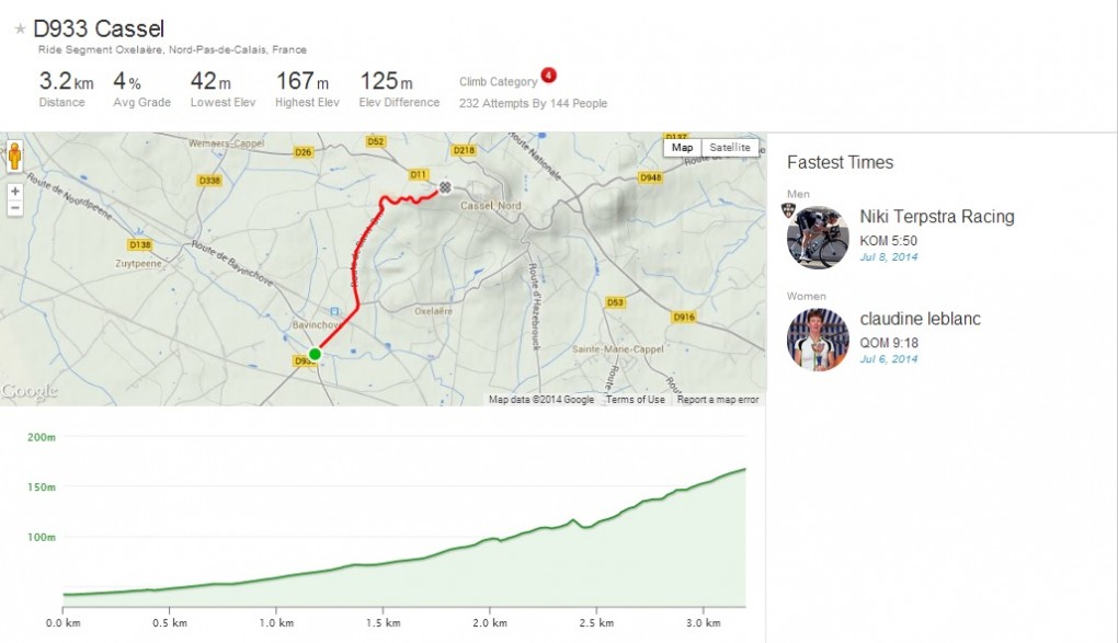 It was the ascent of Cassel, rather than the descent, which made for the most interesting reading as the likes of Niki Terpstra made light work of the climb to get prime position for the descent (pic: Strava)