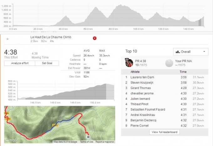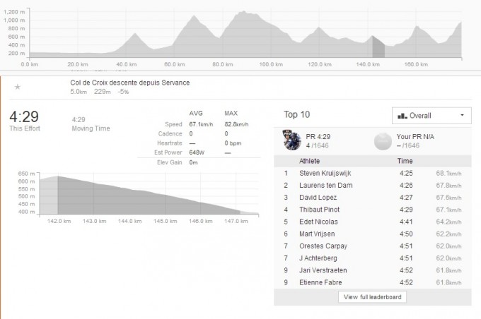 Though only one of the descents en route is available to view as a segment on his ride, the Col de Croix, Pinot’s average speed of in excess of 67km/h certainly does not reflect a man fighting fear.