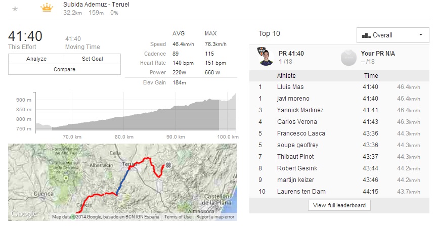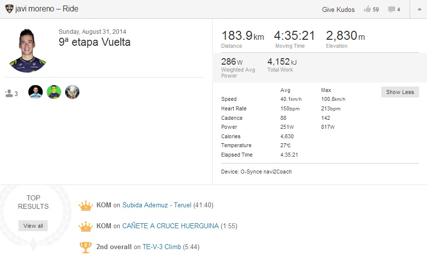 Four of the riders in the move, Carlos Verona (Omega Pharma-Quickstep), Yannick Martinez (Team Europcar), Lluis Mas (Caja Rural) and Javi Moreno (Movistar) have uploaded their rides to route tracking app Strava.