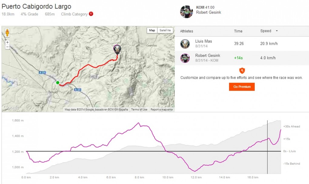 A comparison of Gesink and Mas’ times on the Puerto Cabigordo Largo segment shows how the break looked to press home their advantage on the flatter sections but were reeled in rapidly on the steepest sections.