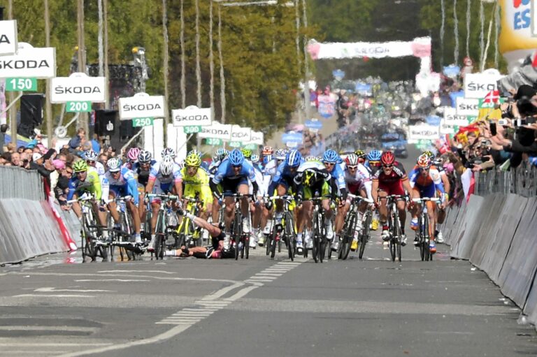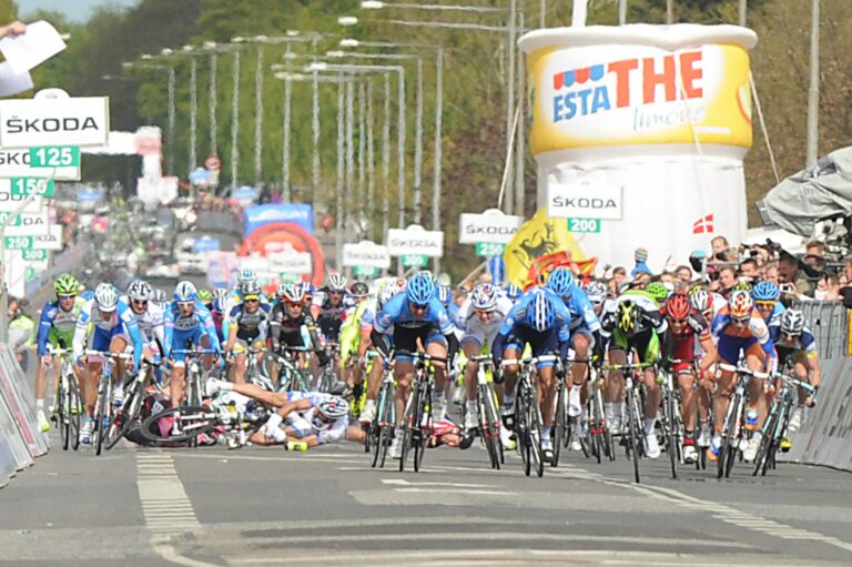 Ferrari causes mass pile-up in finale which leaves Cavendish on the deck and race leader Phinney in an ambulance