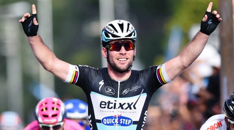 Elia Viviani wins stage after Andre Greipel's relegation; Owain Doull onto podium