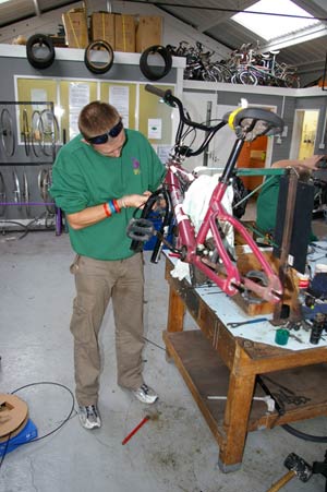 Having brought in a batch of machines, they are stripped to the frame, checked and cleaned and the individual parts sorted and then the process of re-building bikes begins with new parts used where safety dictates.